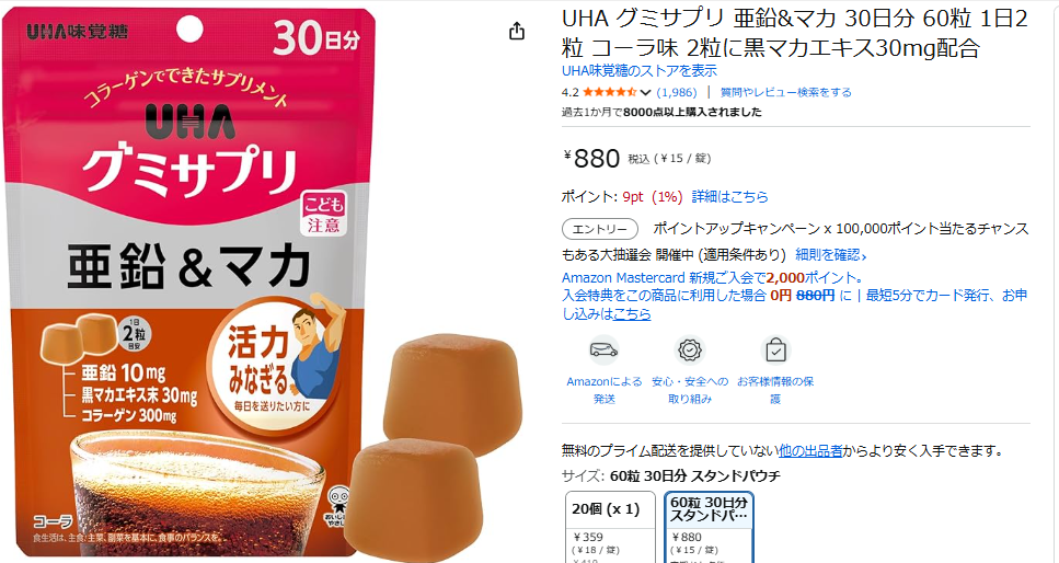 Amazon | UHA グミサプリ 亜鉛&マカ 30日分 60粒 1日2粒 コーラ味 2粒に黒マカエキス30mg配合 | UHA味覚糖 | 亜鉛