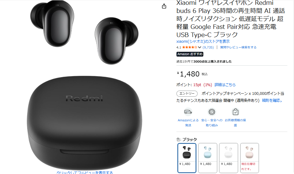 Amazon.co.jp: Xiaomi ワイヤレスイヤホン Redmi buds 6 Play 36時間の再生時間 AI 通話時ノイズリダクション 低遅延モデル 超軽量 Google Fast Pair対応 急速充電 USB Type-C...
